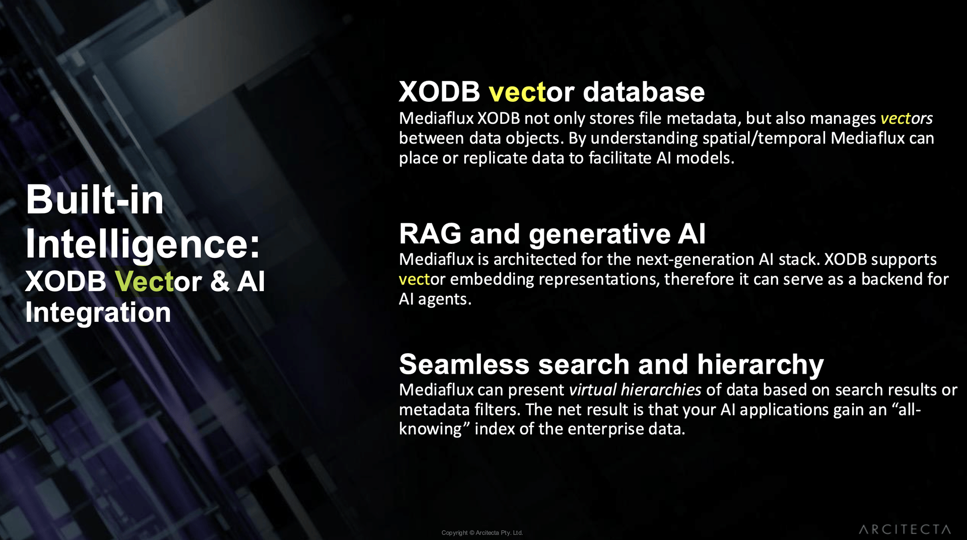 The introduction of vector support to XODB marks Arcitecta’s entry into the age of AI. Lohrey made it clear that the company is not in the business of creating large language models but of ensuring that “we get data to the right AIs that are fit for particular purposes.”