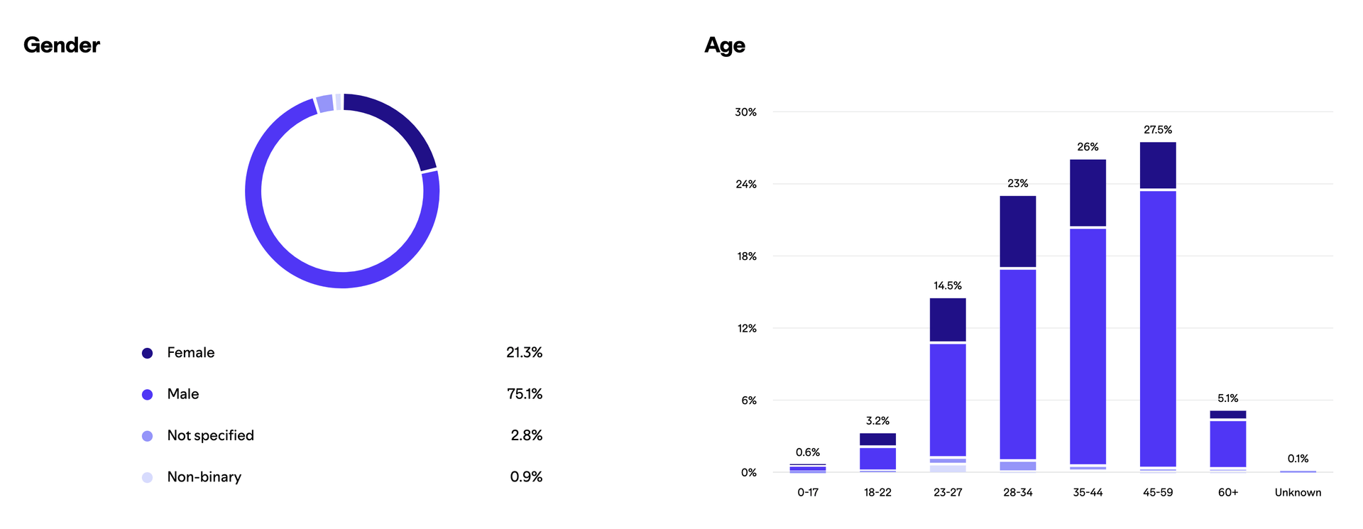Age distribution reinforces the network's relevance to experienced professionals. The most significant segments lie between 28 and 59, with the strongest concentration in the 35-59 range. These are listeners who actively shape strategy, manage teams, control budgets, and make long-term technology decisions.
